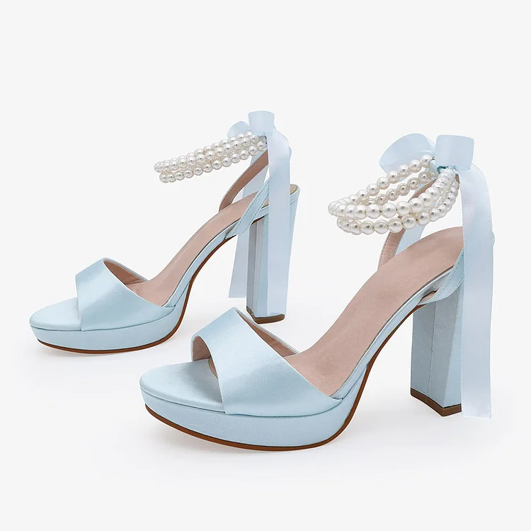 Light Blue Block Heel Double Pearl Ankle Strap Platform Sandals