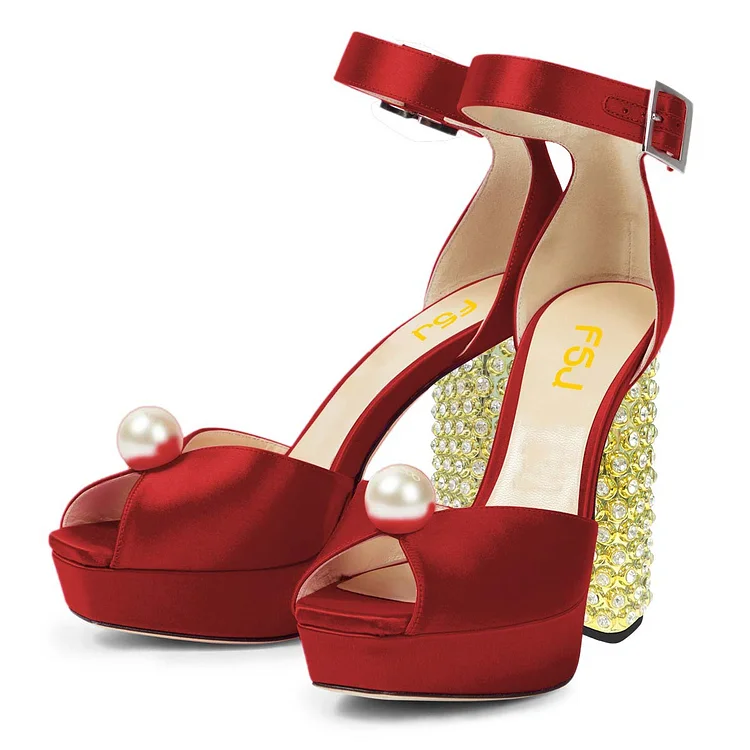 Red Peep Toe Rhinestone Decorative Heel Platform Sandals with Pearl