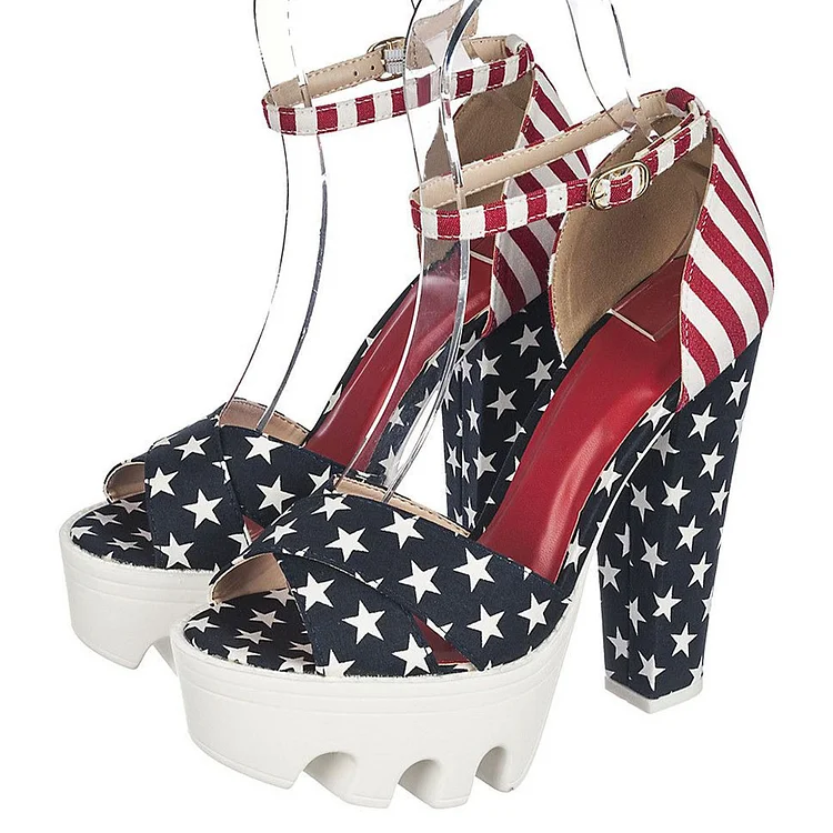 Celebrate style and patriotism with these American Flag Print Ankle Strap Platform Heel Sandals. Featuring a peep-toe design and bold flag print, enjoy comfort and flair in every step.