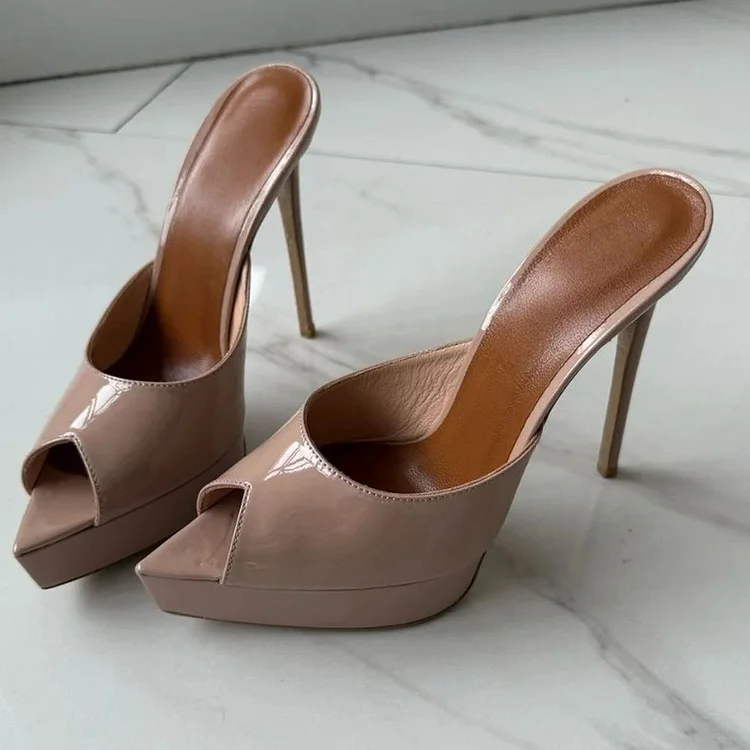 Nude Patent Leather Peep Toe High Heel Mules with Platform