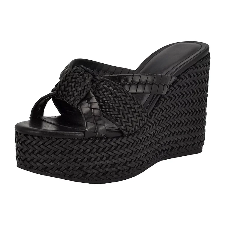 Chic Black Woven Open Round Toe Knot Wedge Heel Platform Mules