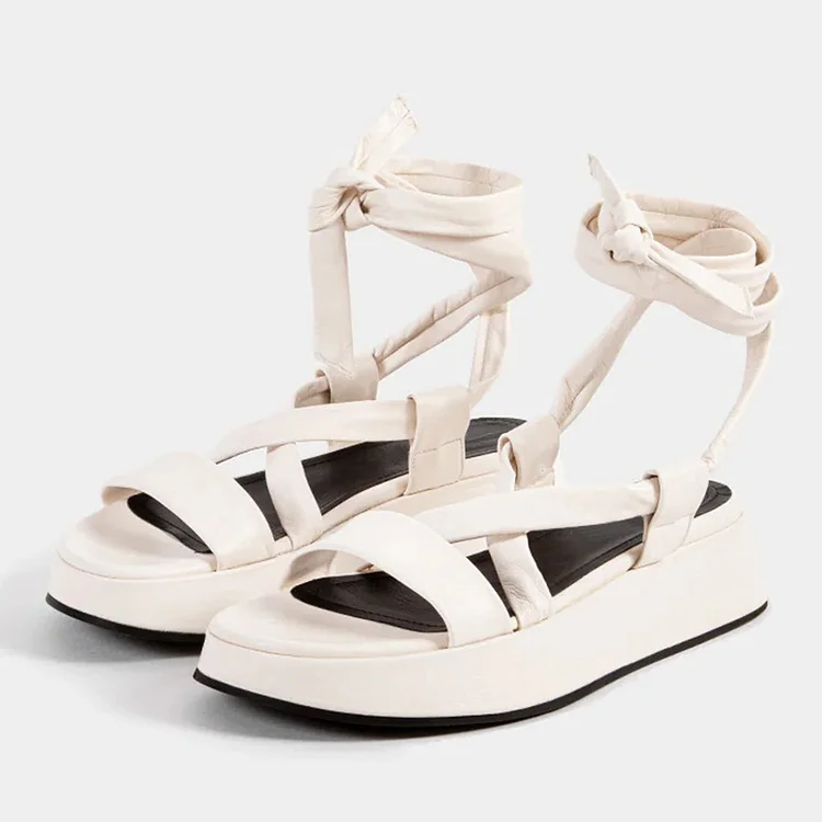 Ivory Open Round Toe Lace-Up Wedge Heel Platform Sandals