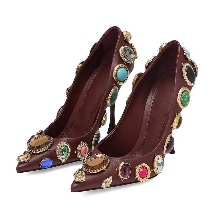 Elevate your style with these exquisite Brown Crystal Embellished Stiletto Heel Pumps. Featuring a pointed toe design and sparkling crystals, these pumps are perfect for adding glamour to any outfit.