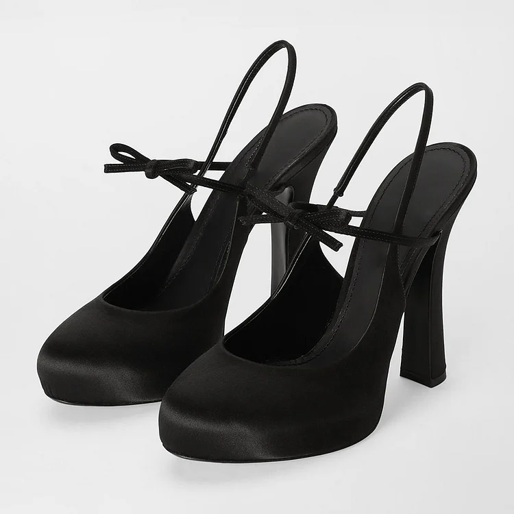 Step into sophistication with our Elegant Black Satin Round Toe Slingback Chunky Heel Platform Pumps. Elevate your style with the perfect blend of grace and glamour.