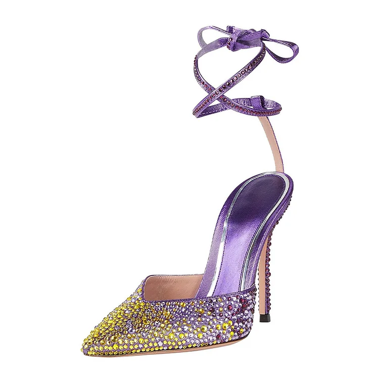 Radiate elegance in these stunning heels. The ombre purple finish, sparkling rhinestone lace-ups, and sharp pointed toe create a captivating, luxurious statement.