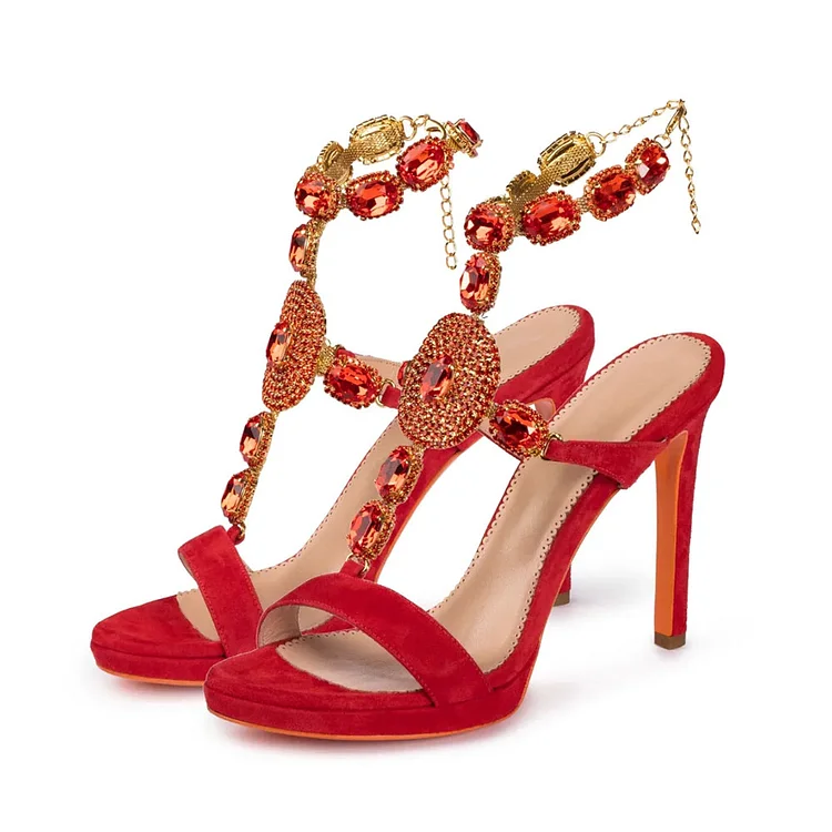 Red Crystal Adorned T-Strap Open Toe Vegan Suede Stiletto Heels
