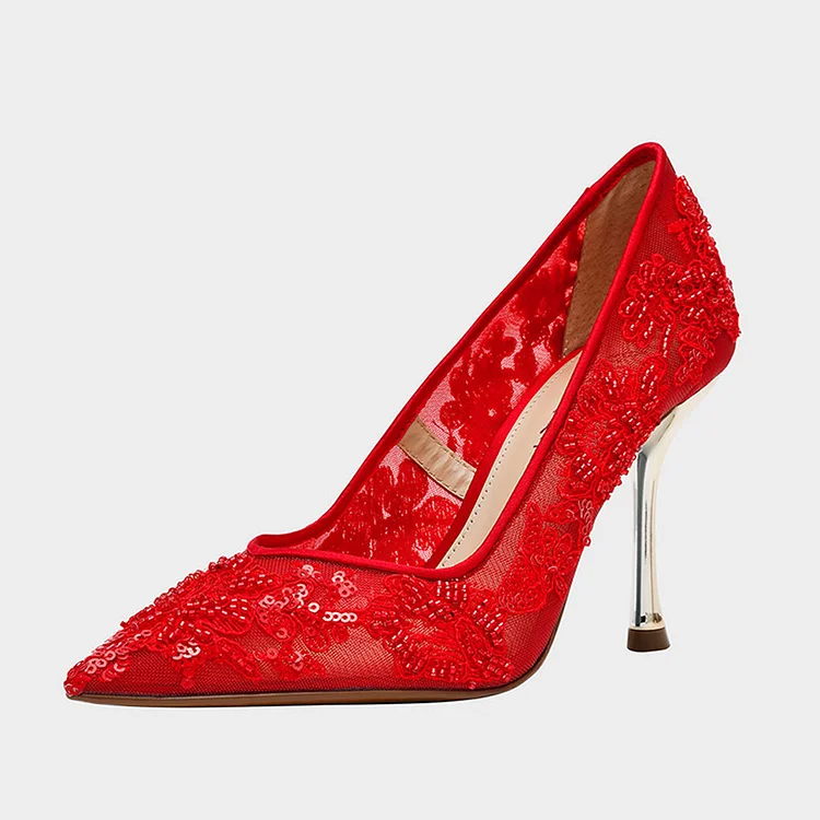 Red Mesh Pointed Toe Beaded and Sequin Embellished Pumps Heels