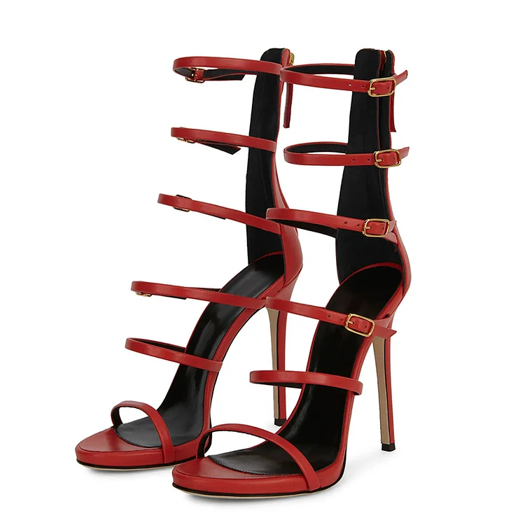 Step out in style with these red heel sandals featuring multiple chic buckle straps and an open round toe design. Elevate your look with flair and sophistication.