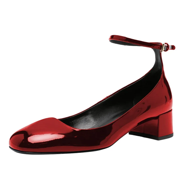 Stride with confidence in these Red Patent Leather Block Heel Ankle Strap Pumps for Women. Elevate your style effortlessly with their bold hue, sleek design, and secure ankle strap.