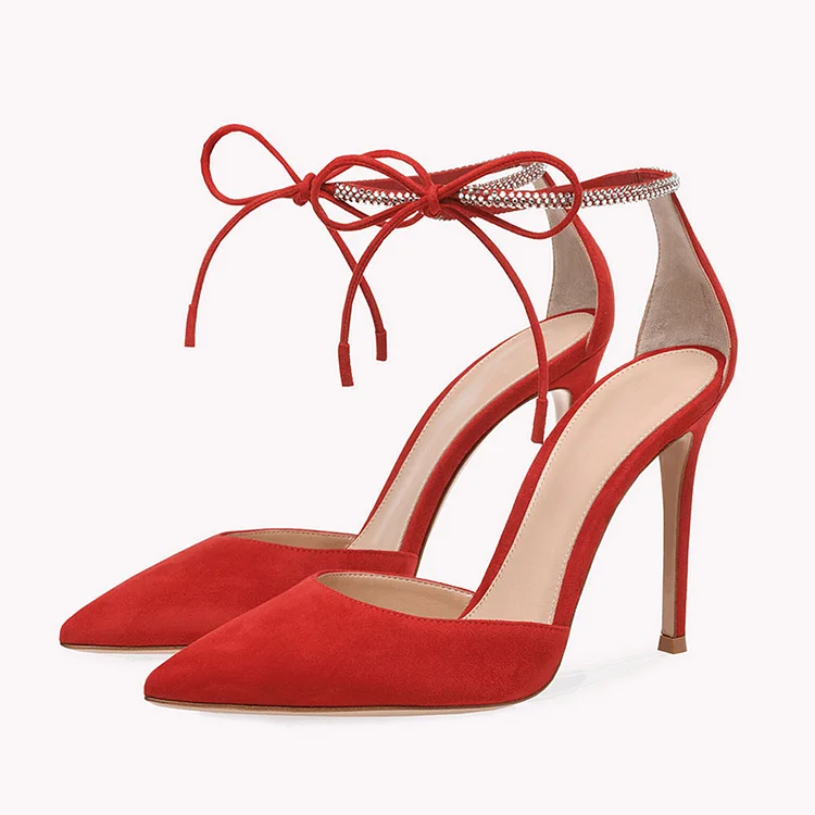 Red Vegan Suede Rhinestone Ankle Tie-Up Pointed Toe Pumps Heels