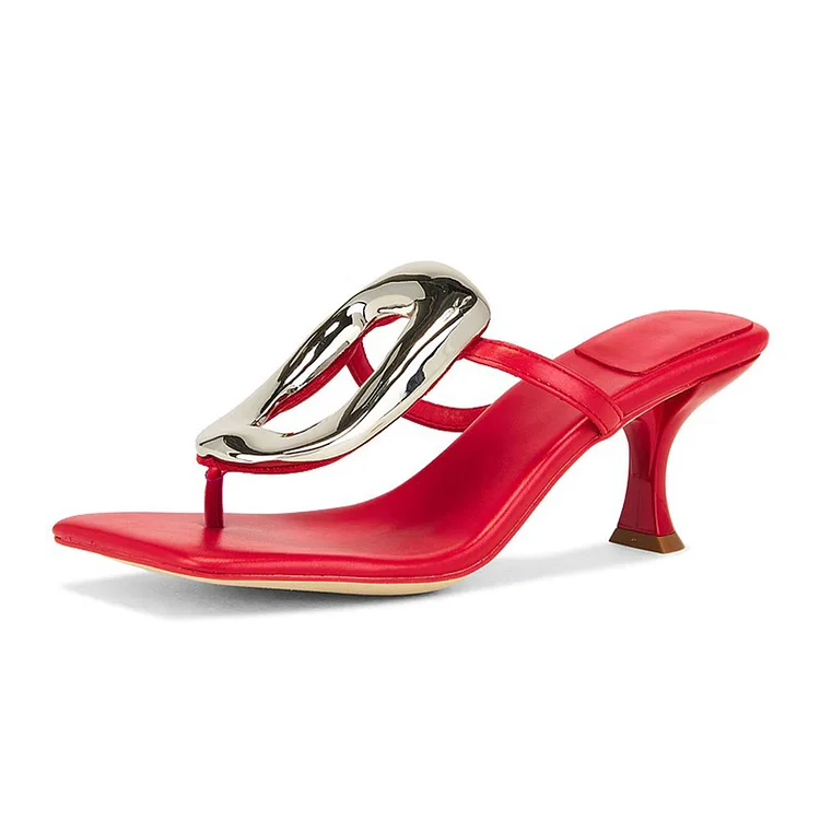 Simple Red Open Square Toe Metal Decor Slip-On Mule Heels