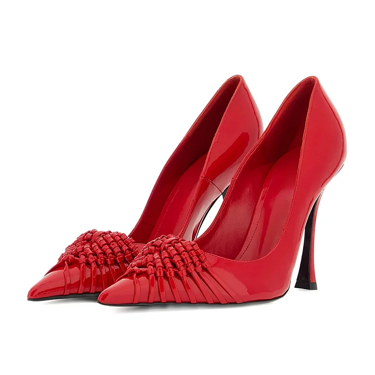 Elevate your style with these trendy red patent leather pumps. Featuring a pointed toe and a chic knot detail on a stiletto heel, these heels are perfect for making a statement.