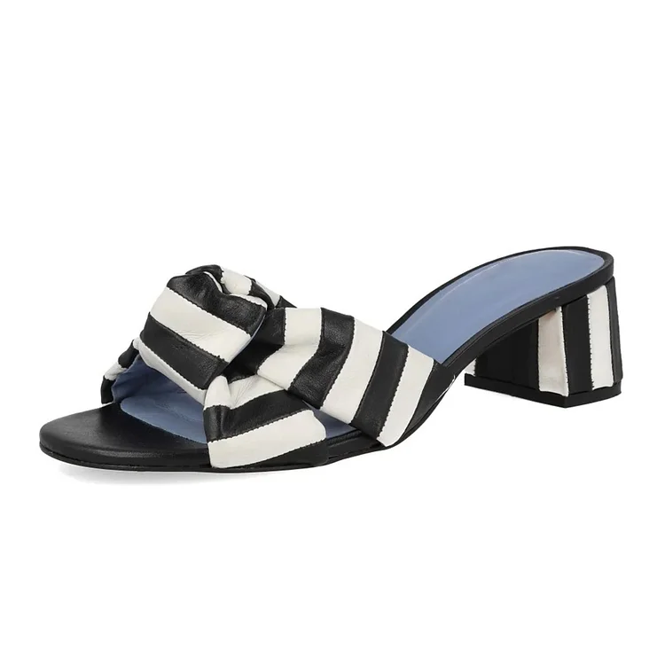 Black and White Stripes Open Round Toe Block Heel Knot Mules Shoes