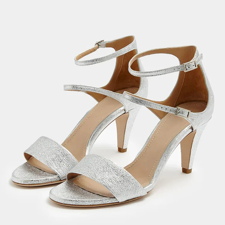 Elevate your style with these crinkled silver sandals featuring double ankle straps and a chic cone heel. The open-toe design adds a touch of sophistication to any outfit.