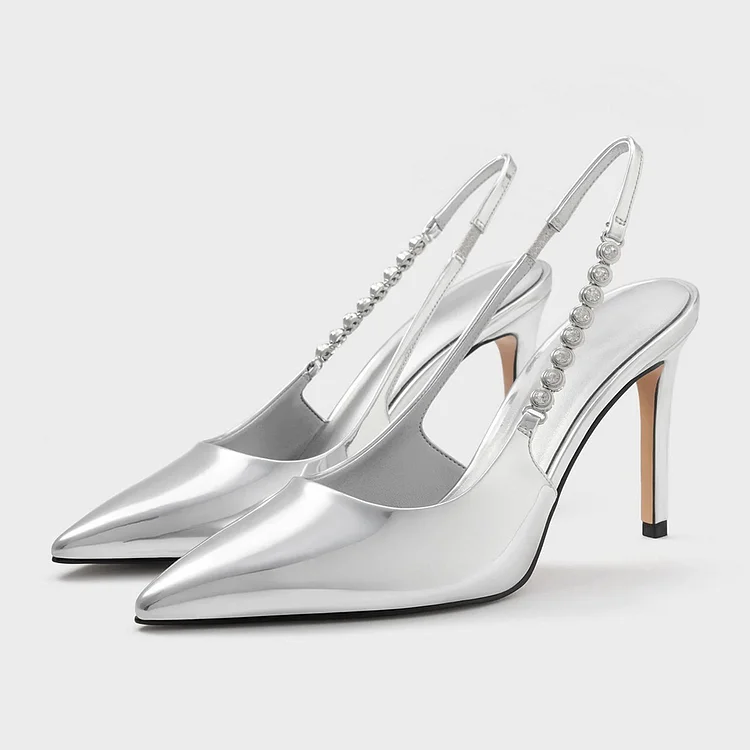 Step into elegance with our Metallic Pointed Toe Rhinestone Slingback Silver Stiletto Heels. Featuring a dazzling rhinestone design, pointed toe, and slender stiletto heel, these heels elevate any outfit effortlessly.