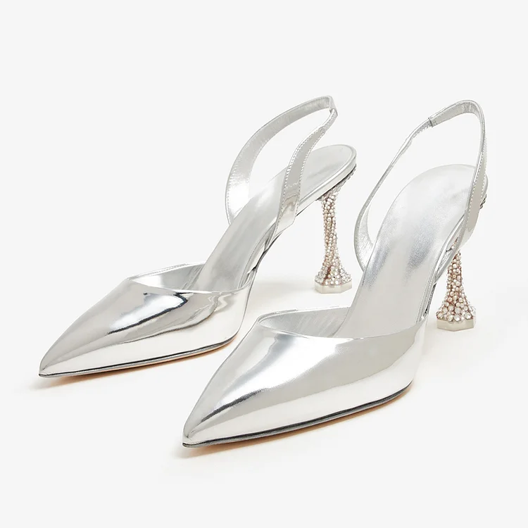 Silver Metallic Finish Pointed Toe Rhinestone Slingback Heels