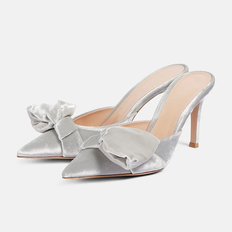 Elevate your style with these Silver Velvet Pointed Toe Bow Decor Stiletto Heel Mules. Luxurious velvet, a chic bow accent, and a sleek stiletto heel make these shoes a glamorous statement piece.