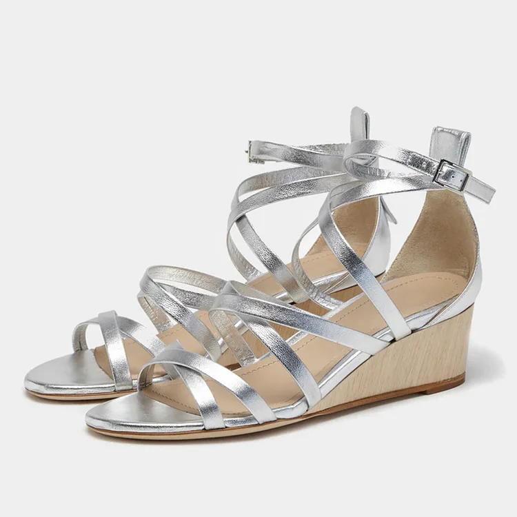 Elevate your style with these chic silver wedge sandals. Featuring a simple crisscross strappy design and open toe, they offer comfort and sophistication for any occasion.