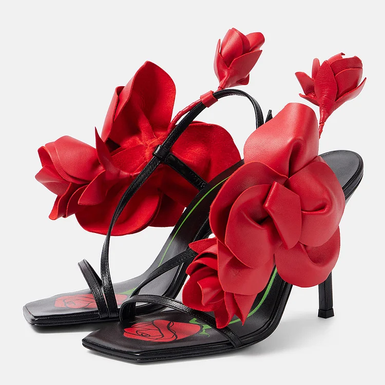 Elevate your style with these stunning Black and Red Floral Decor Open Toe Slingback High Heels Sandals. Featuring a chic design, perfect for adding flair to any outfit.