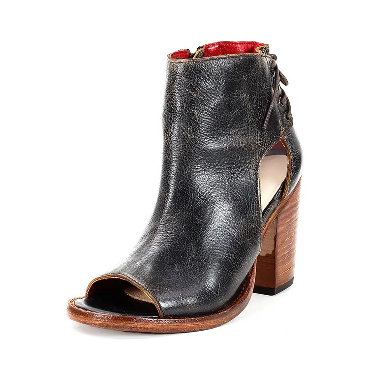 Black Distressed Chunky Heel Cutout Back Lace Summer Boots with Zip