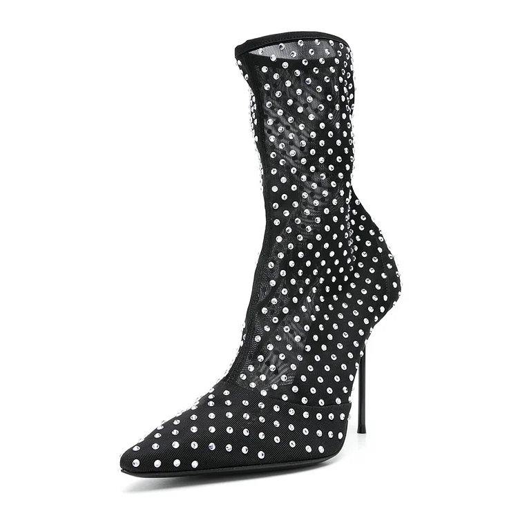 Step into elegance with our Black Mesh Stiletto Heel Rhinestone Pointed Toe Stretch Boots. These stunning boots blend sophistication with sparkle, perfect for making a statement at any occasion.