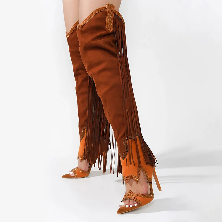 Elevate your style with these stunning Brown and Orange Cutout Open Toe Rhinestone Fringe Over The Knee Boots. Featuring intricate cutouts, rhinestone embellishments, and fringe details for a chic and unique look.
