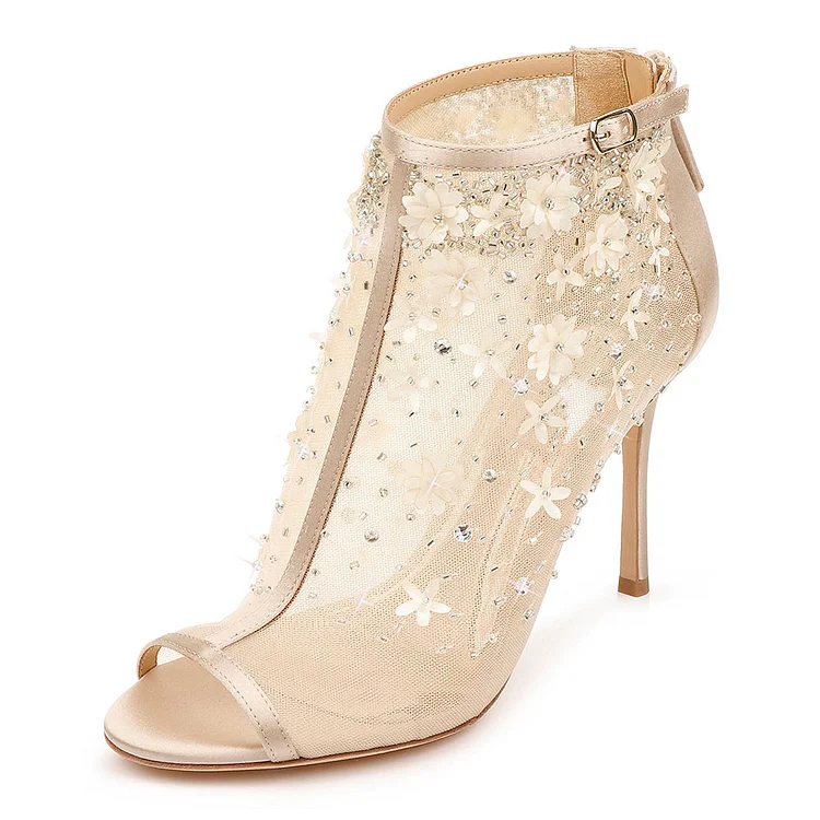 Elevate your style with these stunning Champagne Beaded Open Toe Floral Stiletto Heel Summer Boots. Adorned with intricate beads and a floral design, they are perfect for sunny days and special occasions.