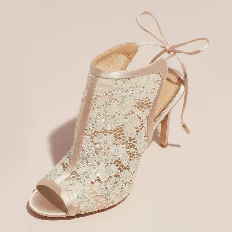 Champagne Lace Stiletto Heel Rhinestone Tie Wedding Open Toe Booties