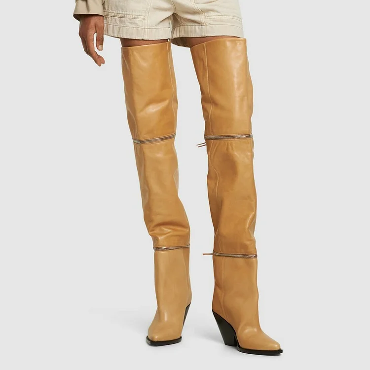 Make a daring statement in our Tan Pointed Toe Thigh High Boots, featuring a sleek Cuban heel and innovative design with functional zip tiers and removable panels. Effortlessly versatile, these boots let you switch from thigh-high to knee-high style in seconds—perfect for fashion-forward looks that command attention.