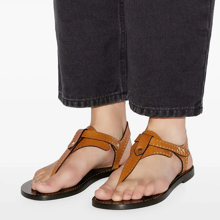 Elevate your summer style with these Casual Brown Studded Flat Sandals for Women. Featuring an open toe and T-bar strap design, these sandals effortlessly blend comfort with chic sophistication.