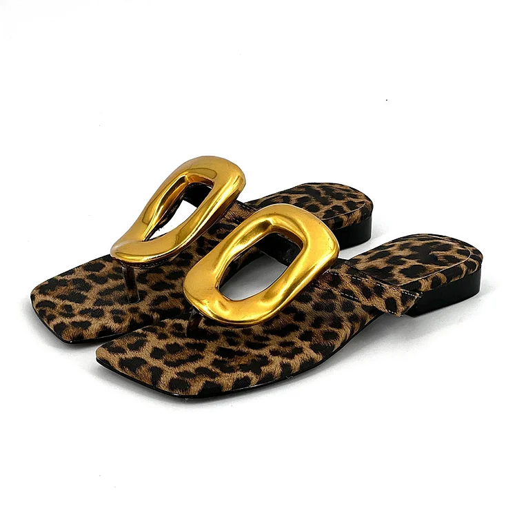 Step out in style with these Leopard Print Open Toe Gold Metal Decor Flat Flip Flops for Women. Comfort meets fashion with a fierce touch in every step you take.