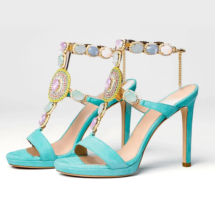 Elevate your style with these stunning Turquoise T-Strap High Heels Sandals. Featuring an open-toe design, rhinestone embellishments, and a chic T-strap, these heels are perfect for adding glamour to any outfit.