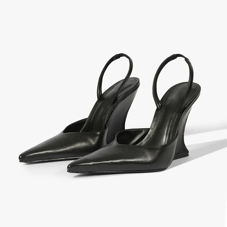 Ladies Simple Black Pointed Toe Slip-On Slingback Wedge Pumps