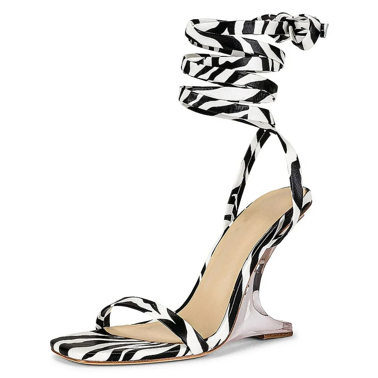 Black and White Zebra Print Open Square Toe Lace-Up Wedge Sandals