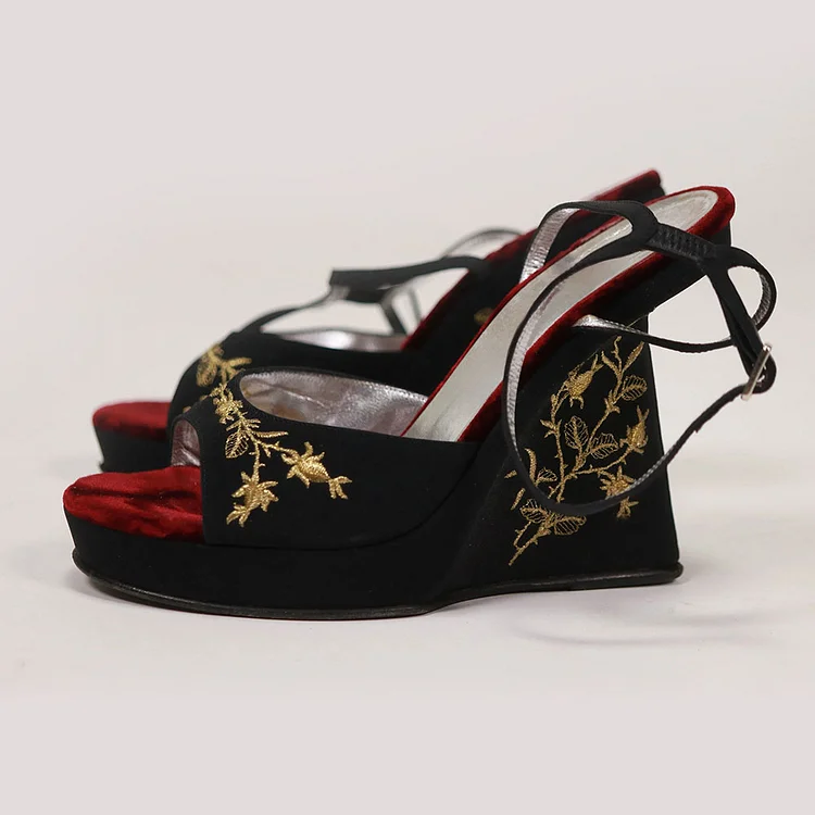 Step into style with our Black Open Toe Gold Flower Embroidered Platform Wedge Sandals. These stunning sandals boast intricate gold floral embroidery on a comfortable and stylish platform wedge design.
