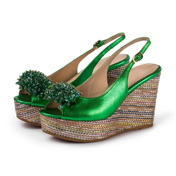 Green Beaded Jewelry Peep Toe Woven Platform Slingback Wedge Heels