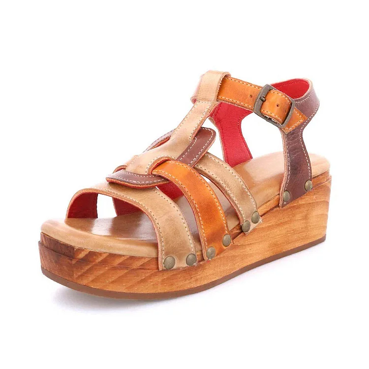 Tan Clog Wedge Heel Stud Embellished Platform Ankle Strap Sandals