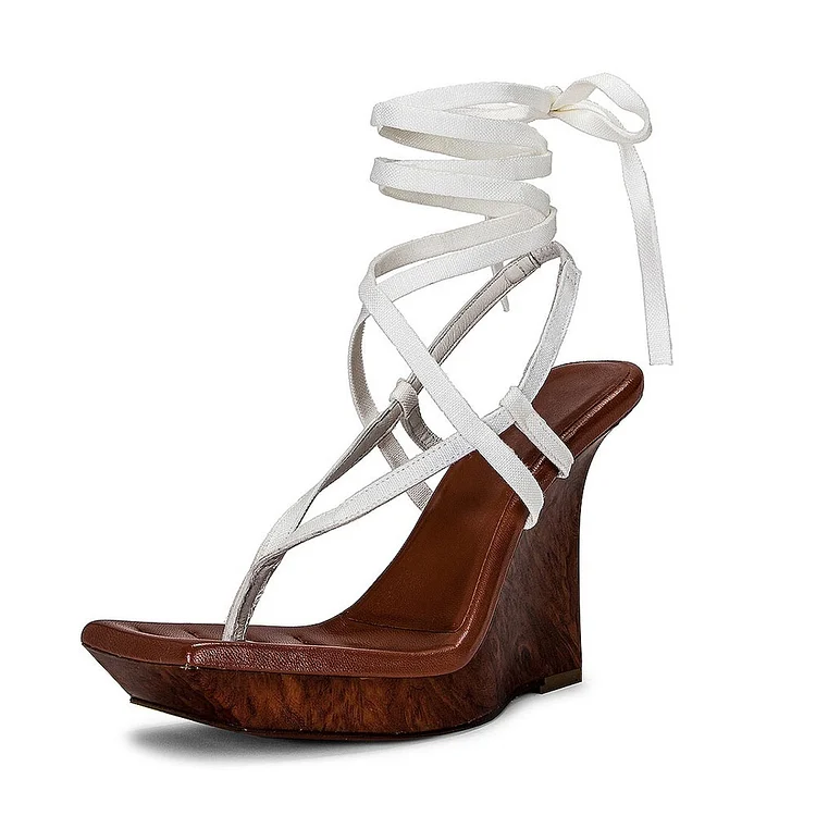 Elevate your style with these trendy white platform wedge heels. Featuring an open square toe and strappy design, these heels are a must-have for a fashion-forward statement.