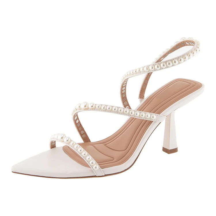 Step into elegance with these wedding-ready sandals. The white flared heels are adorned with pearls, while the slingback design ensures a secure fit, adding a touch of sophistication to your ensemble.