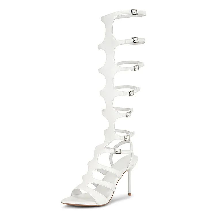 White Multiple Buckle Strap Stiletto Heel Mid Calf Gladiator Sandals