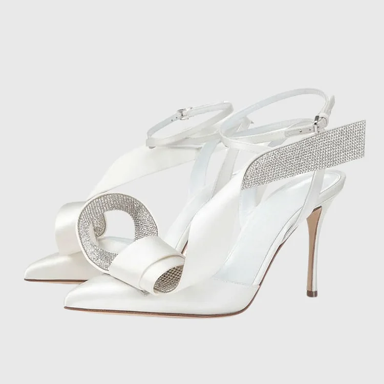 White Spiral Rhinestone Bow Ankle Strap Pointed Toe Stiletto Heels