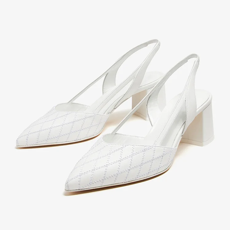 Elevate your style with these chic Women's Block Heel Rhombus Stitching Slingback White Pumps. Featuring a modern design with rhombus stitching and a comfortable block heel, perfect for any occasion.