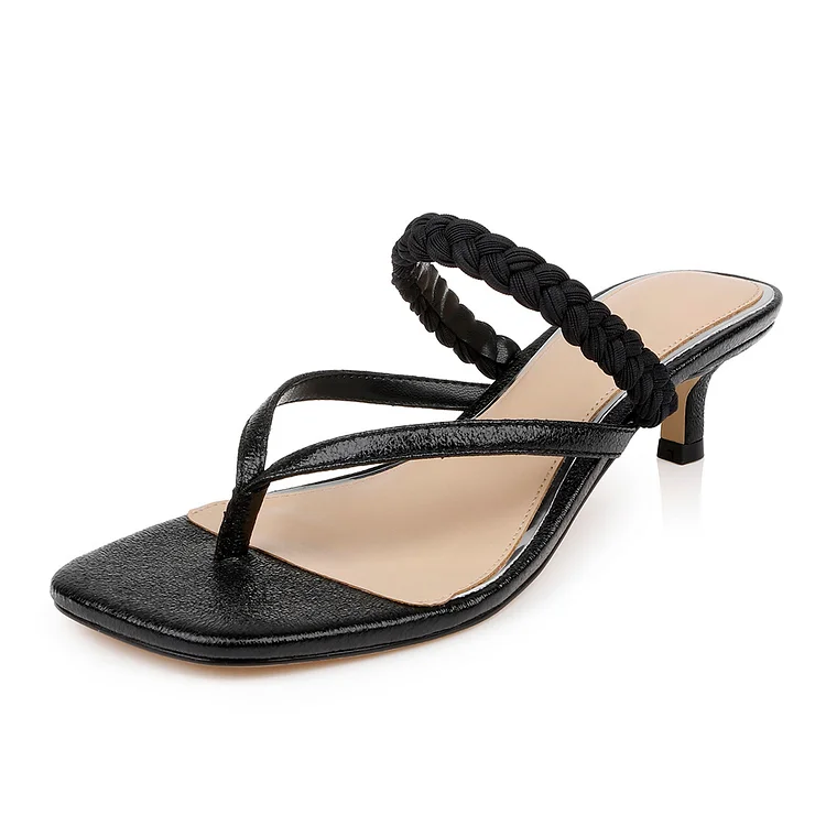 Step out in style with these chic Black Braided Strap Open Square Toe Kitten Heel Flip Flops for Women. Perfect blend of comfort and sophistication for any occasion.
