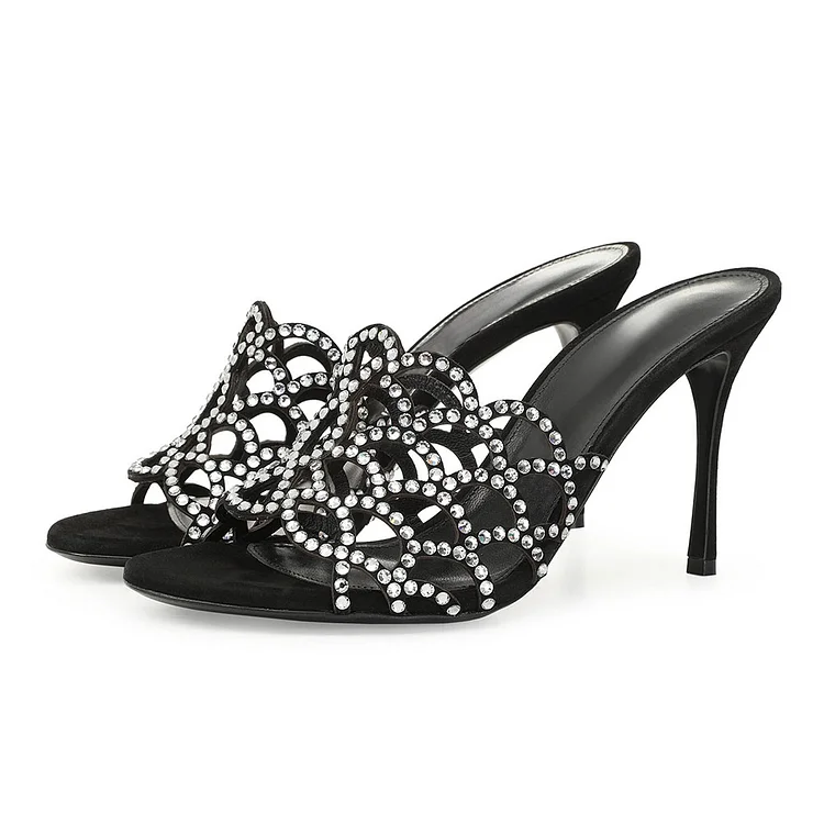 Step into sophistication with our Black Hollow Out Open Toe Rhinestone Slip-On High Heel sandals. Featuring dazzling rhinestones and a chic design, these heels effortlessly elevate any ensemble with style and flair.