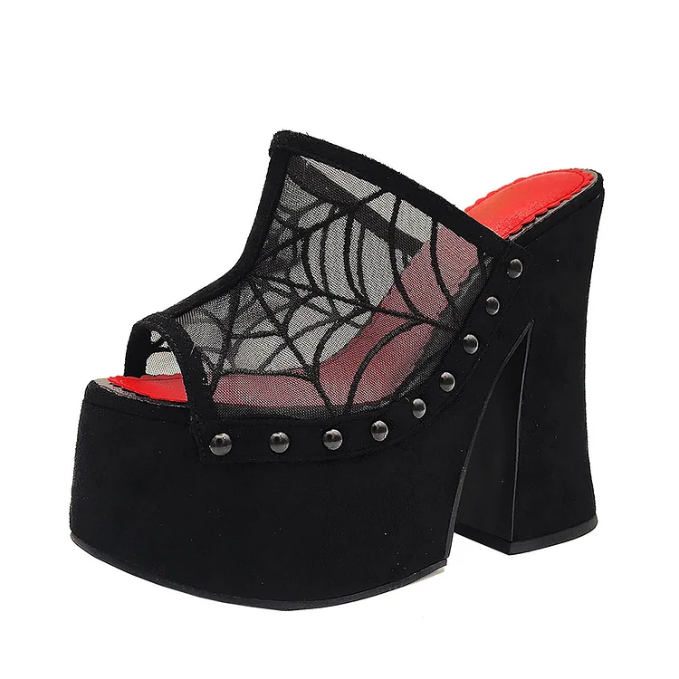 Step into style with these Black Mesh Web Embroidered Peep Toe Studded Platform Heel Sandals. Elevated by intricate embroidery and edgy studs, these heels are a perfect blend of sophistication and flair.
