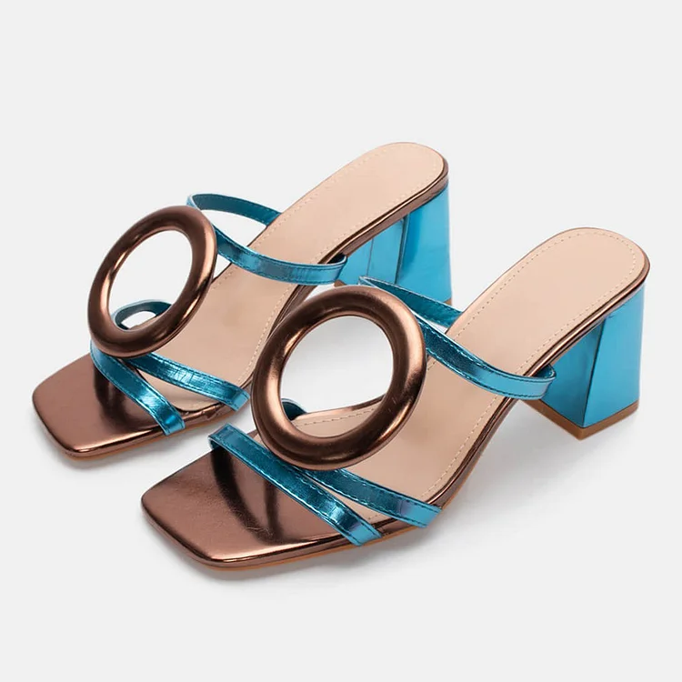 Elevate your style with our Brown and Blue Metallic Open Square Toe Mule Heels. Featuring a chic ring detail, these statement shoes effortlessly blend sophistication with trendy flair.