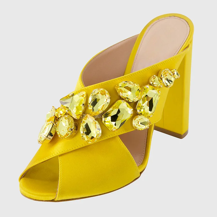 FSJ Stylish Yellow Satin Rhinestone Peep Toe High Heel Mules