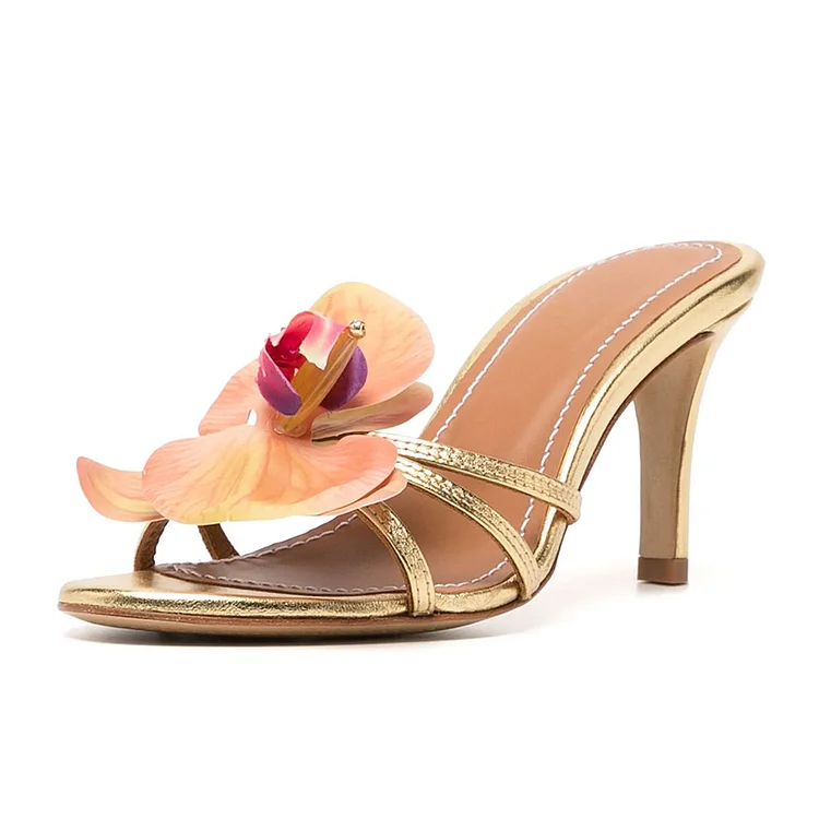 Elevate your style with these chic Gold Metallic Finish Mule Heels. Featuring an open-toe design and trendy floral accent, these heels are perfect for adding a touch of glamour to any outfit.