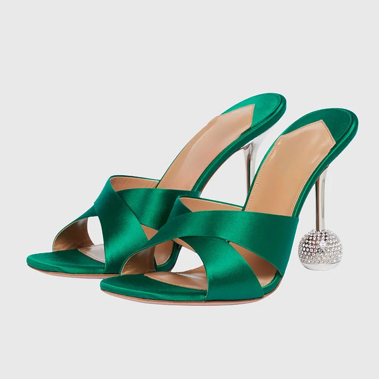 Step out in style with our Green Satin Open Square Toe Rhinestone Decorative Heel Mules. These shoes blend elegance and charm, featuring a dazzling rhinestone heel for a touch of glamour.