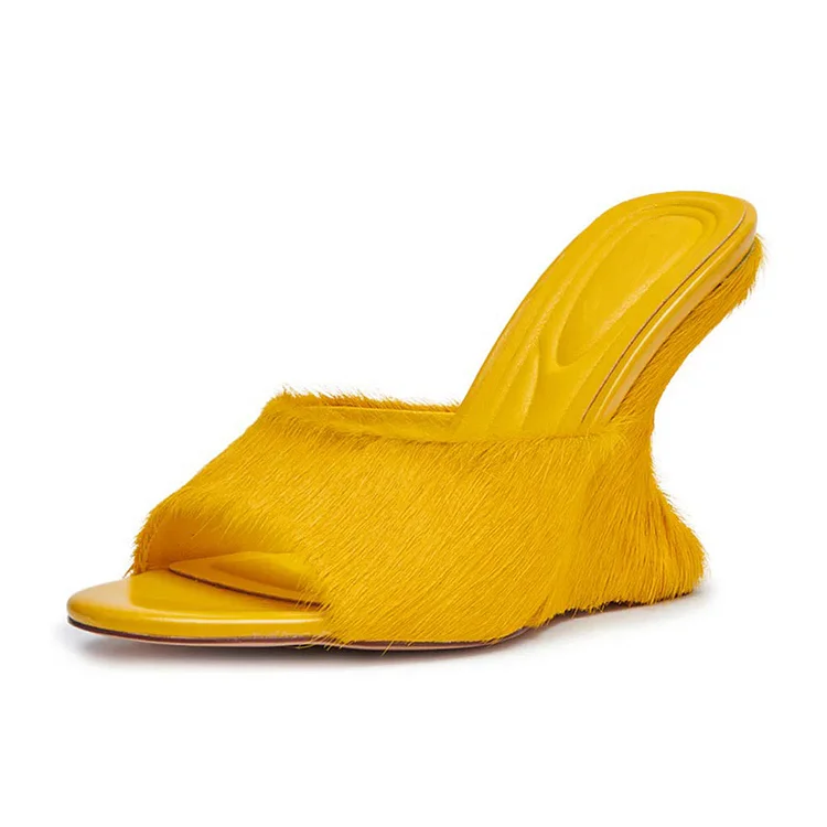 Mustard Yellow Open Toe Furry Wedge Heel Women's Mules Shoes